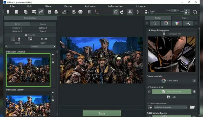 Description: AI Filter #2 professional is a unique image editing program that represents a revolution in photo editing through the use of self-trainable artificial intelligence (AI). This software allows its users to create unique AI photo filters from an existing photo edit and apply them to other images. Until now, this could only be achieved to a very limited extent with LUT styles.