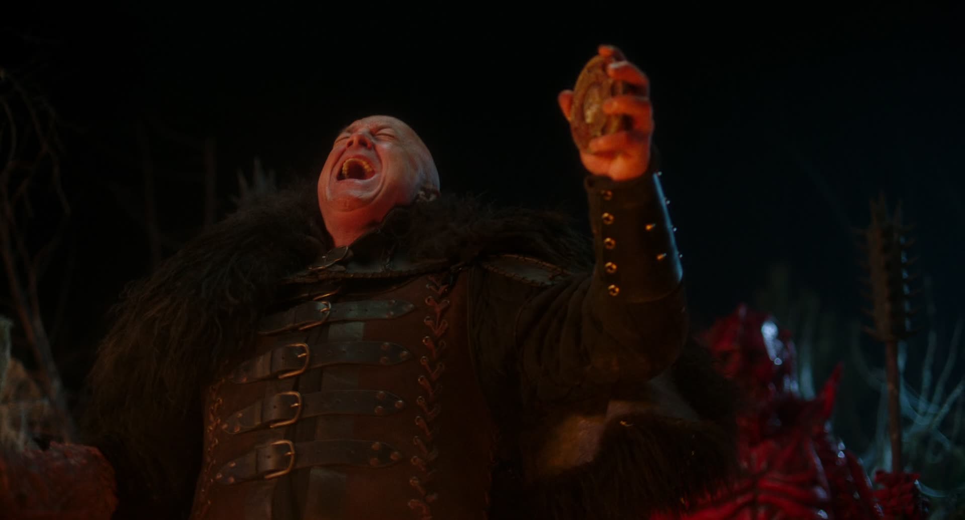 Plot: The warrior Deathstalker is tasked by an old witch to obtain and unite the three powers of creation - a chalice, an amulet, and a sword - lest the evil magician Munkar get them and use them for nefarious purposes. After obtaining the sword, Deathstalker joins with other travelers going to the Big Tournament to determine the strongest warrior. The false king holds the true princess in captivity, and plots to have Deathstalker killed, and Deathstalker must fight to free the princess.
