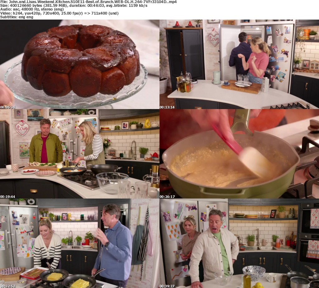 John and Lisa revisit some of their most popular brunch recipes from over the years with a menu to suit everyone’s tastebuds – they start with two beautiful brunches, pull-apart monkey bread that’s great for sharing and hot smoked salmon kedgeree which is a comforting way to start the day. To shake up weekend mornings, it’s then time for John and Lisa’s banana and cacao breakfast shake and fun bacon and egg pretzels – that’s followed by two decadent and cheesy dishes of sausage onion rarebit and stuffed French toast. The episode finishes up with a sweet treat – chocolate brioche bake, always a firm, family favourite – and a delicious Turkish eggs and flatbread dish that is both a feast for the eyes and stomach.