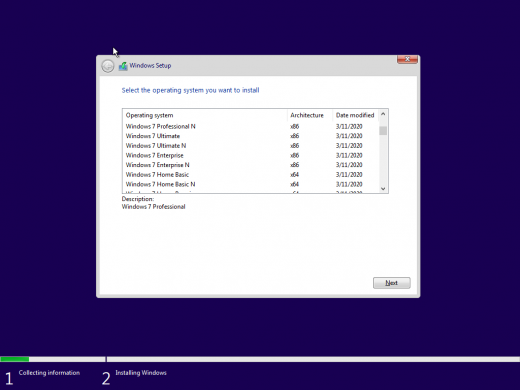 List of windows editions available for installation: